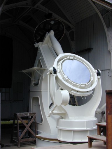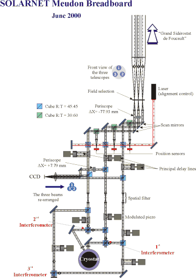 During the beginning of 2000, the whole experiment will move, again, to the “Grand Sidérostat de Foucault” (cf. Fig. 14) at Meudon Observatory for a demonstration directly on the Sun (and the major planets) of the cophasing of the 3 telescopes. This time, fine pointing is implemented (3 active mirrors) and the interferometric table is placed inside the building behind a large optical window in order to carry a complete evaluation of the cophasing performances.