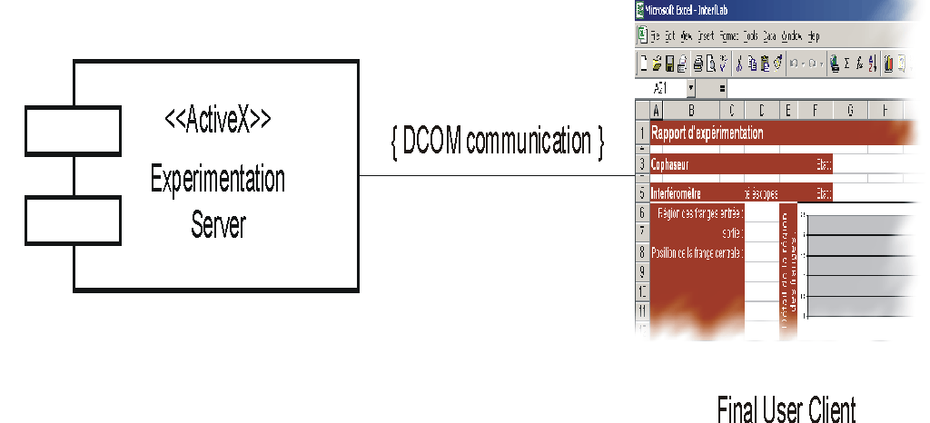 To interface this platform free component to the laboratory needs, a COM layer was added. Therefore the experimentation component is easily insertable in any COM compatible application. The best demonstration of this possibility is the final user client mentioned previously. This single user interface to the experimentation was implemented within Excel in VBA (Visual Basic for Application) language. Just imagine: to start a new experimentation on any machine of the laboratory domain, you just have to open Excel, select the InterfLab document template, configure the cophaser and nested interferometers, click on Start command of the InterfLab custom toolbar and results fill appropriate worksheets of your Excel workbook!