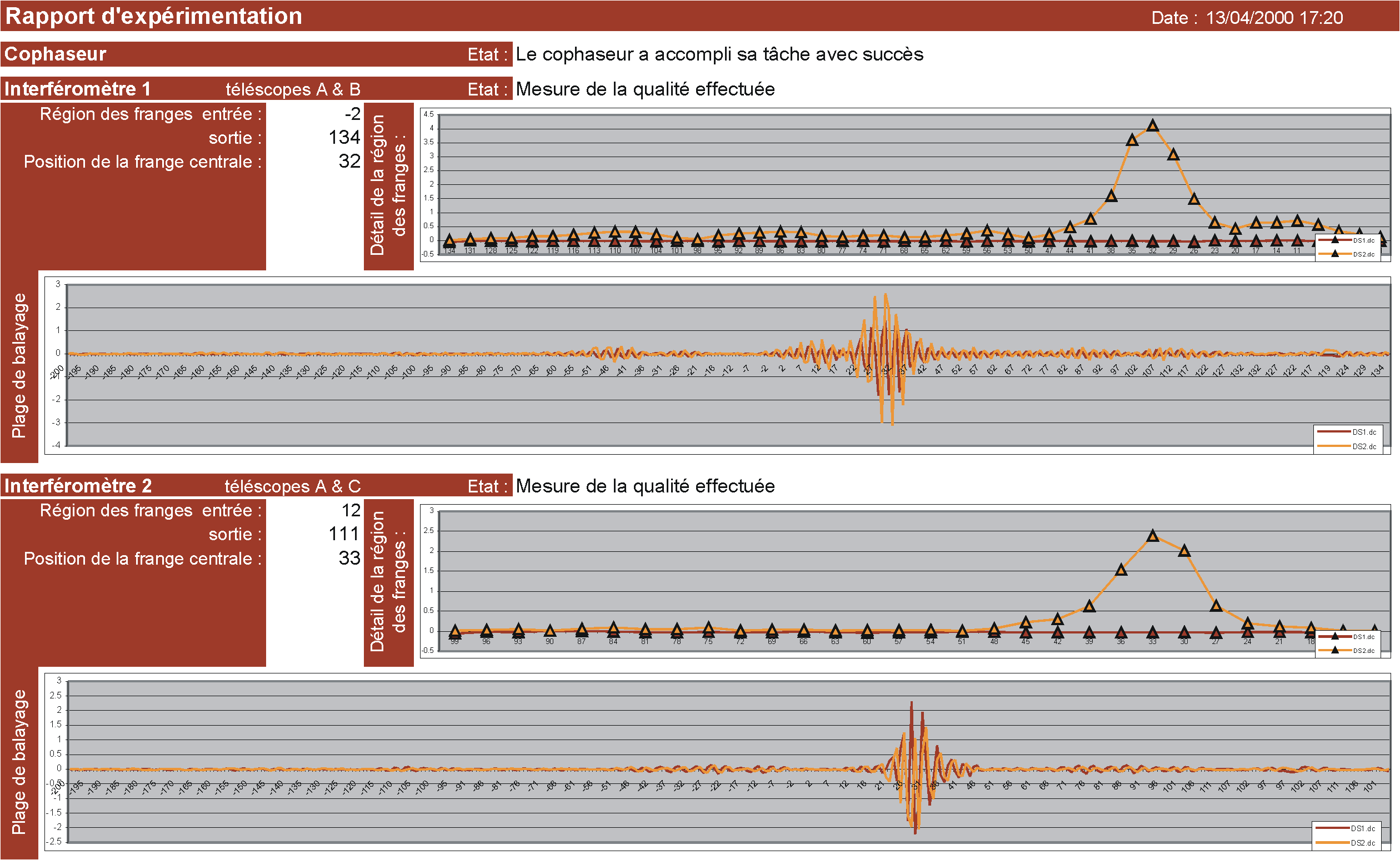 For the two interferometers that control the 3-telescope interferometer we have two curves (cf. Fig. 11). The lower ones shows the signal issued of the synchronous detection at simple frequency (brown curve DS1) and the one above, the synchronous detection at double frequency (orange curve DS2), and this during the Principal Delay Line move. The phase between these two signals is well equal to π/4 as the mathematical simulation showed it. The signals’ form is not perfect, because of the average of multiple measures and the elementary move of the delay line (0.1 µm) which is not infinitely small.