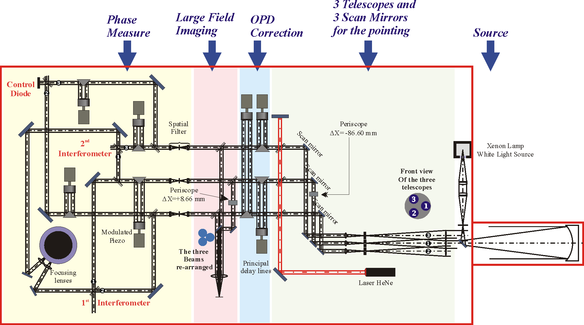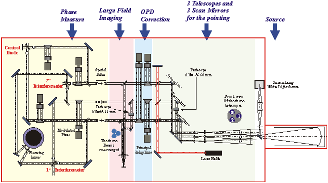 The cophasing of two telescopes was presented in our Zero OPD Breadboard Design Report [4] as well as our preliminary ideas on the cophasing (active control of the phase) of 3 telescopes in particular the control strategy of the couple of interferometers of the 3 interferometers in serie or in parallel (e.g. Fig. 2 of [4]). Indeed if the OPD (Optical Path Delay) between the telescope 1 and the telescope 2 and the OPD between 2 and 3 are equal to zero, then the OPD between 1 and 3 is necessarily null. The third interferometer, between telescopes 1 and 3, allows to verify this last point.