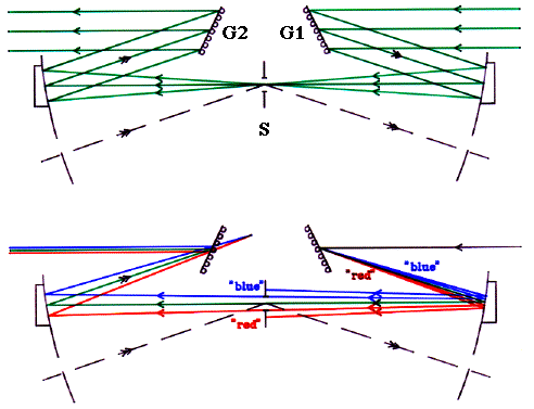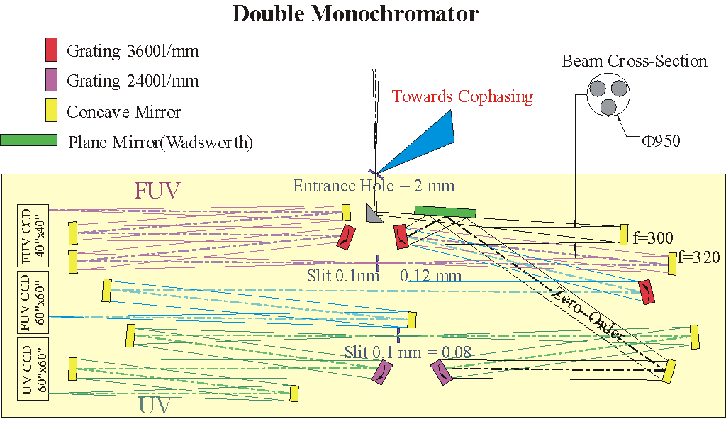 The Double Monochromator (DM) is the focal instrument of SOLARNET. It has powerful instantaneous imaging capabilities in the FUV and UV. As shown hereafter, the DM uses two gratings (G1 & G2), the first one introducing a dispersion of the image on an intermediate slit (S) while the second, G2, recombines the dispersed light on the CCD in output. This allows to have a filtered image (40" x 40" field-of-view) as narrow as allowed by the slit width and aberrations (20-40 mÅ or so).