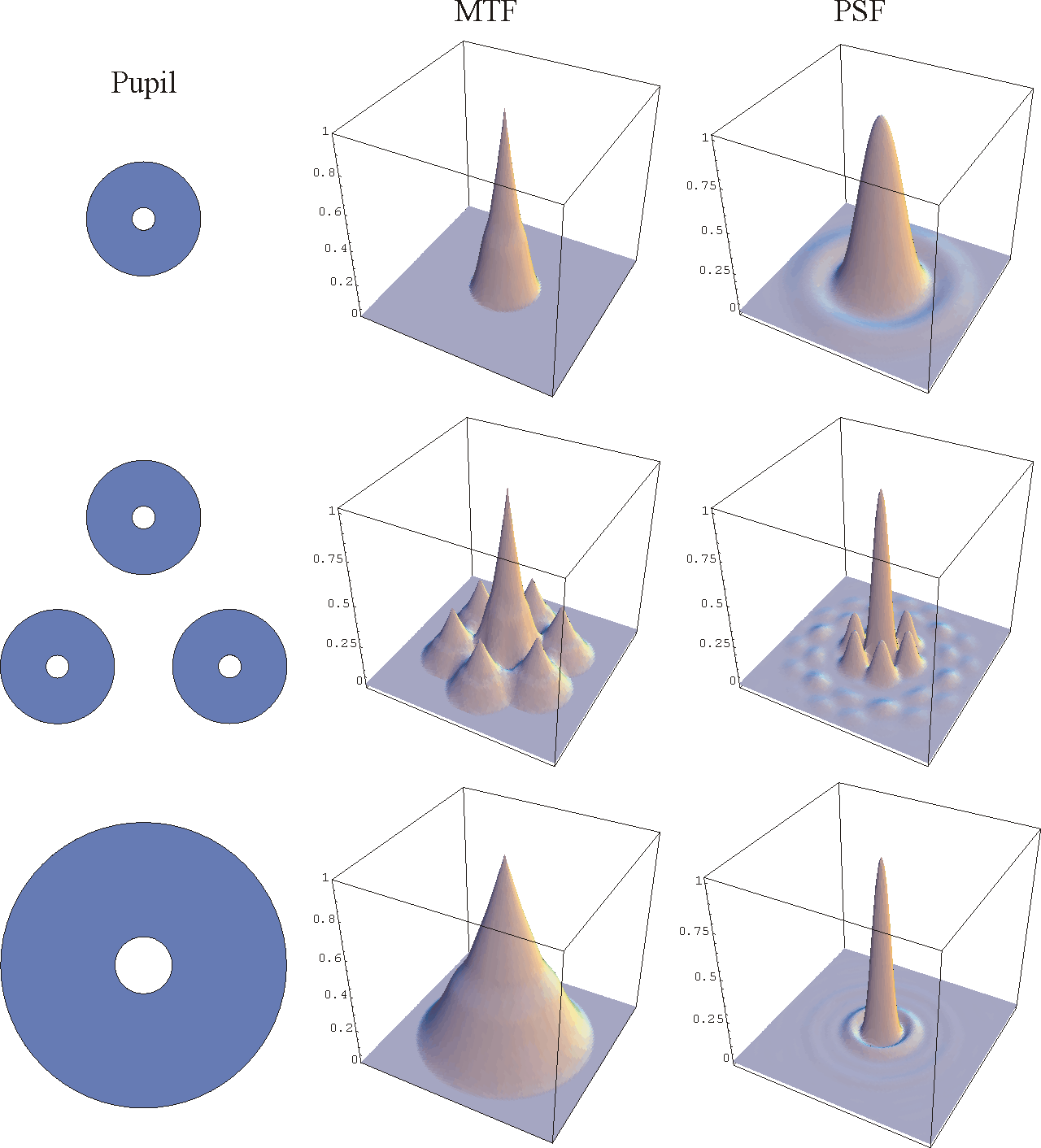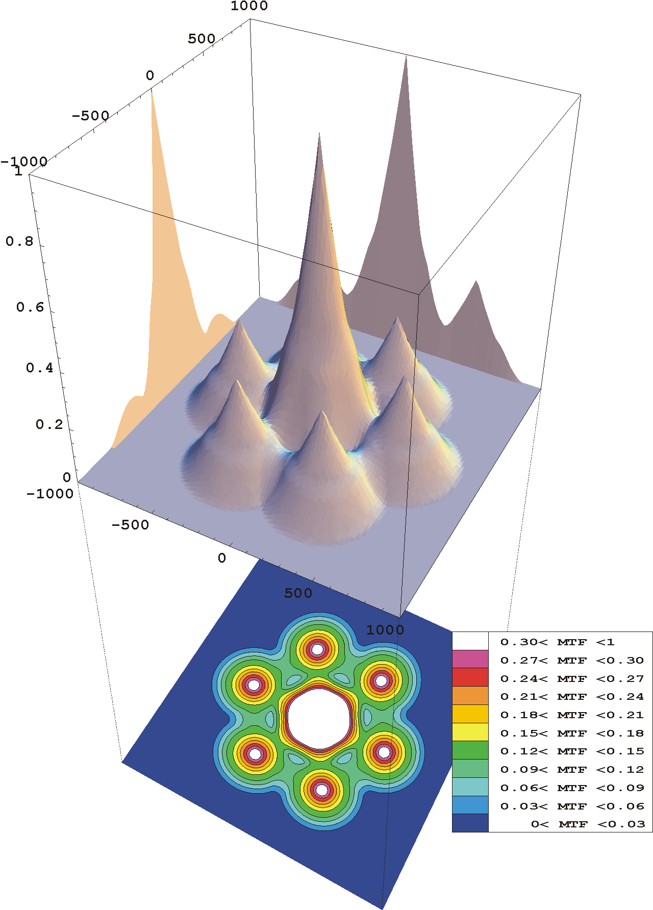 A compact interferometer like SOLARNET (3 telescopes of Ø350 mm on a 1 meter baseline) is comparable to a single dish telescope in many respects since the Modulation Transfer Function (MTF) covers all the spatial frequencies of the image. The repartition is not excellent for intermediate frequencies since deeps up to 7.3% can be noticed. Nevertheless high frequencies are well represented and a simple deconvolution (or even Wiener filtering) allows to recover totally the image information. The secondary peaks are one third the central peak amplitude which explains the excellent imaging capabilities of the interferometer.