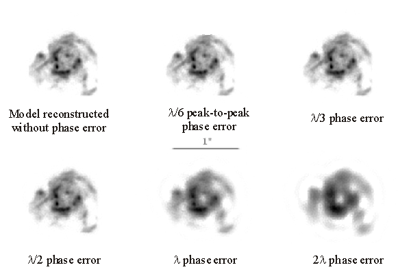 Image reconstruction of a complex and extended object with SOLARNET. Note the excellent reconstruction capabilities (both in terms of spatial resolution and intensities) when the phase errors are below 1/6th of the wavelength. This indicates the minimum requirements to achieve with the cophasing system. These images result from the simple deconvolution of a single exposure made with SOLARNET: a SOLARNET 2D-interferogram directly gives a solar image.
