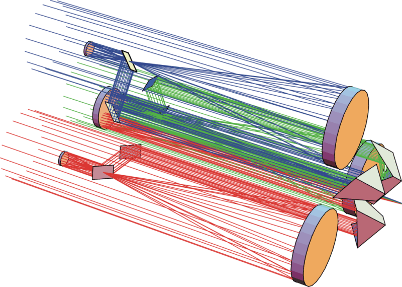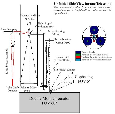 SOLARNET has 3 Gregory telescopes of Ø350 mm diameter (f=1050 mm). For each telescope, the secondary is Ø70 mm (f=210 mm). A tertiary plane mirror helps to select a 5 arcmin field on the Sun and to deflect the rest of the solar field to the pointing system (made on the solar limb: precision expected is a few mas). The forth mirror is the "Active Steering Mirror" that folds the beam to a retroreflector that controls the Optical Path Delay (OPD) between the three beams of the SOLARNET interferometer. Following the retroreflectors, the three beams are focused by the recombination mirror (Ø190 mm) on the Double Monochromator (DM). On the entrance slight of the DM where the image is formed, a field of 40" is selected while the rest of the 5 arcmin field-of-view is directed towards the Cophasing System, a set of three reference White Light Interferometers which make an absolute measure of the phases (by double synchronous detection) and control the Delay Lines (the retroreflectors).
